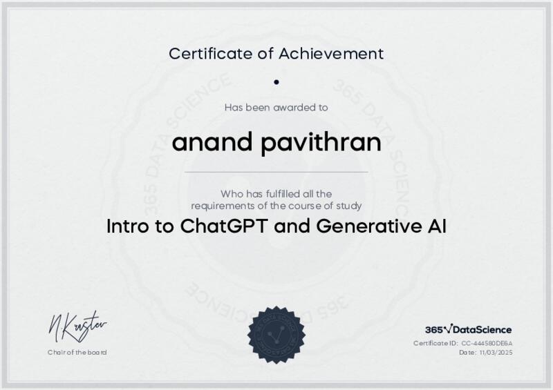This user has been awarded the Intro to ChatGPT and Generative AI Certificate for successfully completing the course exam. Holding this certificate demonstrates their proficiency on the topic and signifies they are qualified to apply their newly acquired expertise in the fields of data analytics and data science.