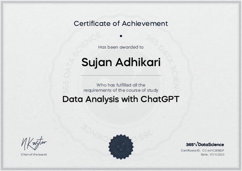 This user has been awarded the Data Analysis with ChatGPT Certificate for successfully completing the course exam. Holding this certificate demonstrates their proficiency on the topic and signifies they are qualified to apply their newly acquired expertise in the fields of data analytics and data science.