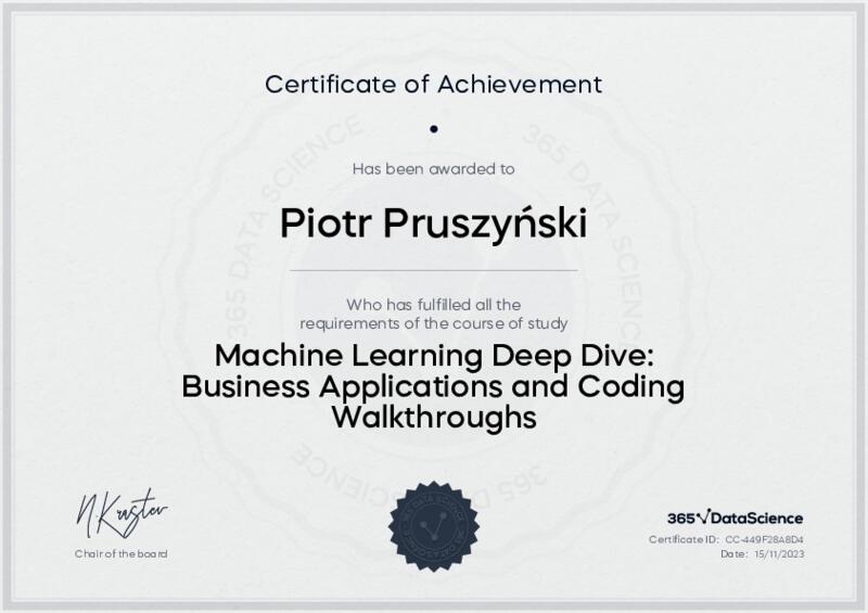 This user has been awarded the Machine Learning Deep Dive: Business Applications and Coding Walkthroughs Certificate for successfully completing the course exam. Holding this certificate demonstrates their proficiency on the topic and signifies they are qualified to apply their newly acquired expertise in the fields of data analytics and data science.