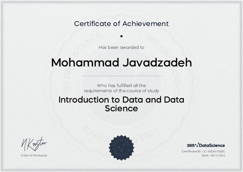 This user has been awarded the Introduction to Data and Data Science Certificate for successfully completing the course exam. Holding this certificate demonstrates their proficiency on the topic and signifies they are qualified to apply their newly acquired expertise in the fields of data analytics and data science.