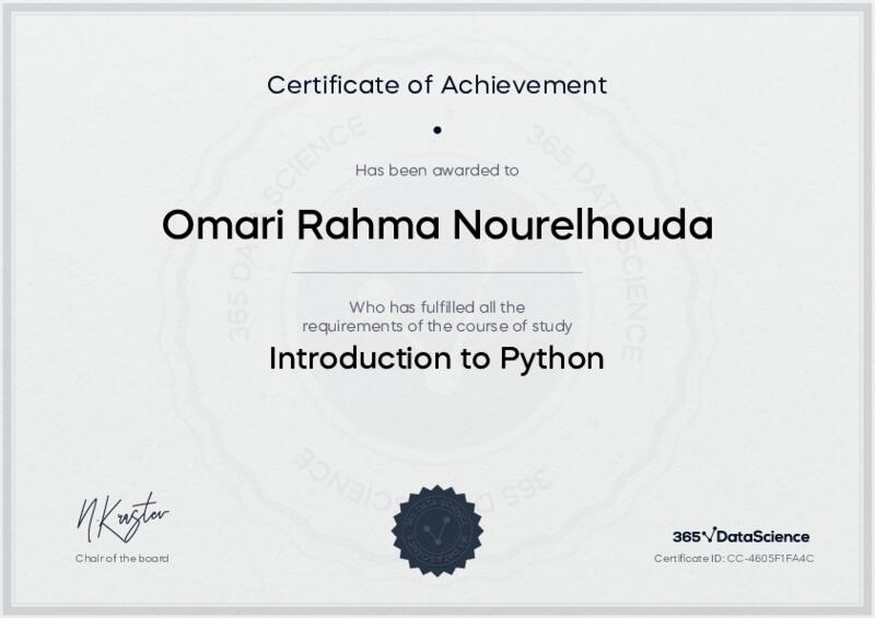 This user has been awarded the Introduction to Python Certificate for successfully completing the course exam. Holding this certificate demonstrates their proficiency on the topic and signifies they are qualified to apply their newly acquired expertise in the fields of data analytics and data science.