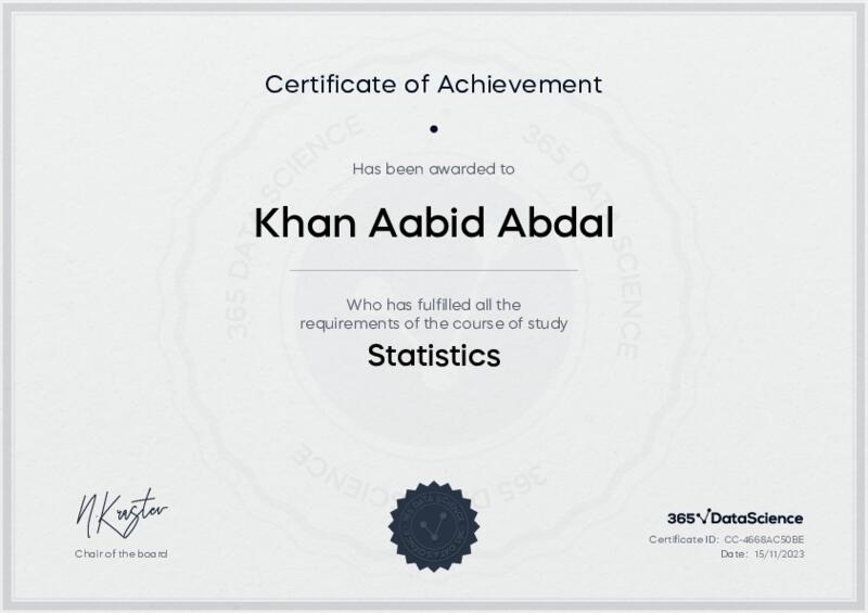This user has been awarded the Statistics Certificate for successfully completing the course exam. Holding this certificate demonstrates their proficiency on the topic and signifies they are qualified to apply their newly acquired expertise in the fields of data analytics and data science.