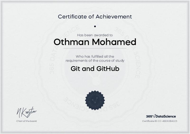 This user has been awarded the Git and GitHub Certificate for successfully completing the course exam. Holding this certificate demonstrates their proficiency on the topic and signifies they are qualified to apply their newly acquired expertise in the fields of data analytics and data science.