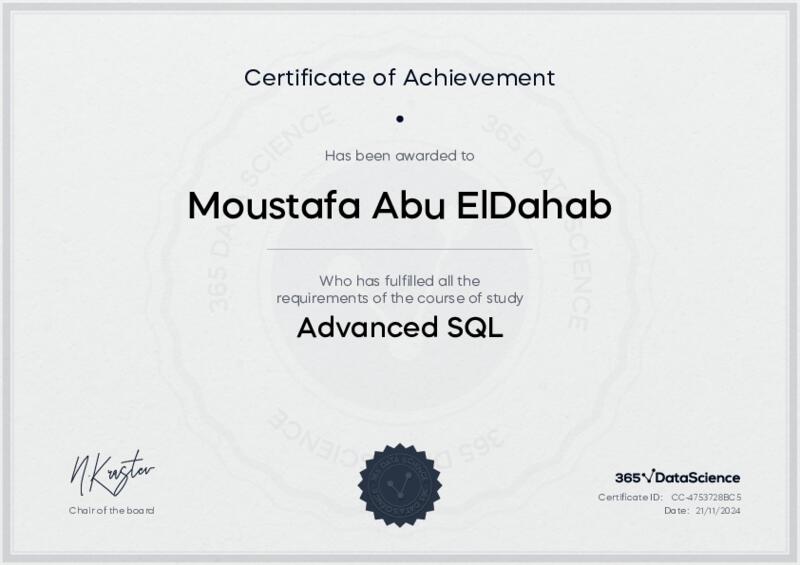 This user has been awarded the Advanced SQL Certificate for successfully completing the course exam. Holding this certificate demonstrates their proficiency on the topic and signifies they are qualified to apply their newly acquired expertise in the fields of data analytics and data science.