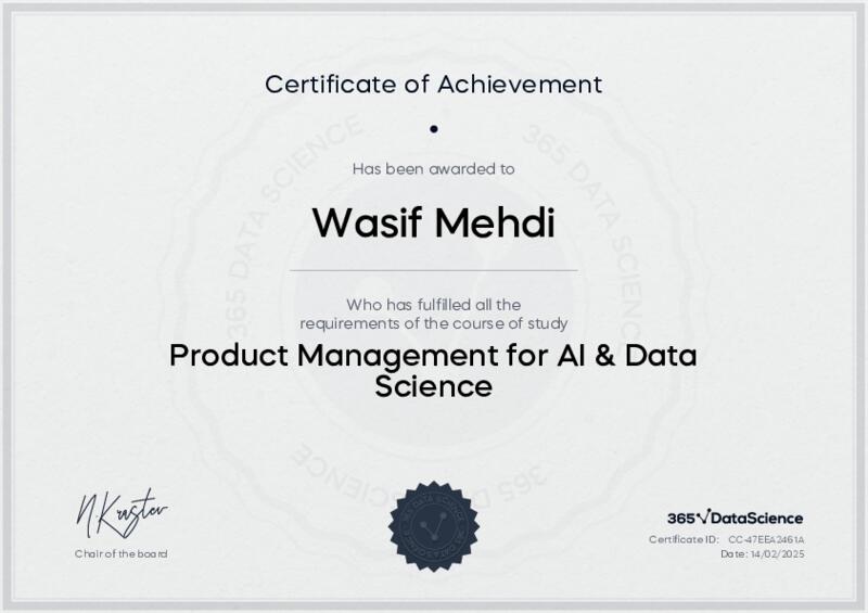 This user has been awarded the Product Management for AI & Data Science Certificate for successfully completing the course exam. Holding this certificate demonstrates their proficiency on the topic and signifies they are qualified to apply their newly acquired expertise in the fields of data analytics and data science.