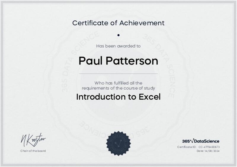 This user has been awarded the Introduction to Excel Certificate for successfully completing the course exam. Holding this certificate demonstrates their proficiency on the topic and signifies they are qualified to apply their newly acquired expertise in the fields of data analytics and data science.