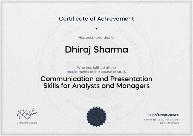 This user has been awarded the Communication and Presentation Skills for Analysts and Managers Certificate for successfully completing the course exam. Holding this certificate demonstrates their proficiency on the topic and signifies they are qualified to apply their newly acquired expertise in the fields of data analytics and data science.