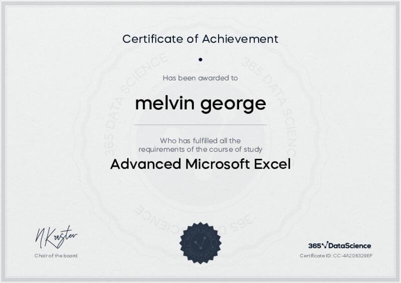 This user has been awarded the Advanced Microsoft Excel Certificate for successfully completing the course exam. Holding this certificate demonstrates their proficiency on the topic and signifies they are qualified to apply their newly acquired expertise in the fields of data analytics and data science.