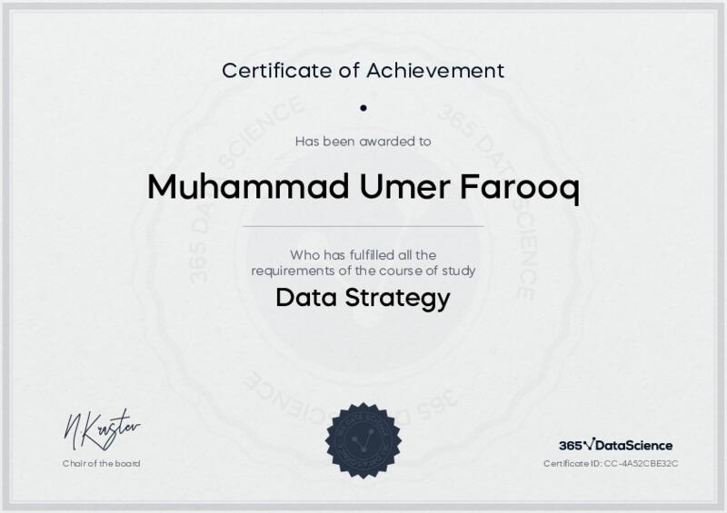 This user has been awarded the Data Strategy Certificate for successfully completing the course exam. Holding this certificate demonstrates their proficiency on the topic and signifies they are qualified to apply their newly acquired expertise in the fields of data analytics and data science.