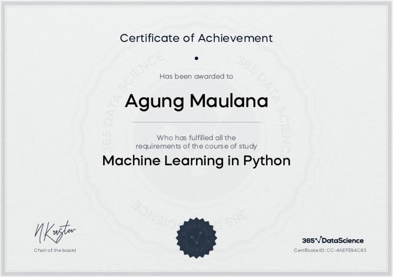 This user has been awarded the Machine Learning in Python Certificate for successfully completing the course exam. Holding this certificate demonstrates their proficiency on the topic and signifies they are qualified to apply their newly acquired expertise in the fields of data analytics and data science.