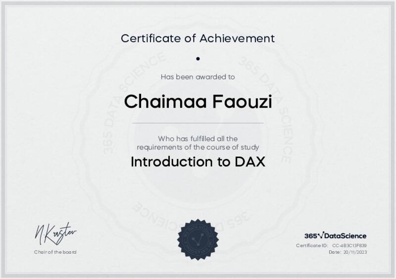 This user has been awarded the Introduction to DAX Certificate for successfully completing the course exam. Holding this certificate demonstrates their proficiency on the topic and signifies they are qualified to apply their newly acquired expertise in the fields of data analytics and data science.