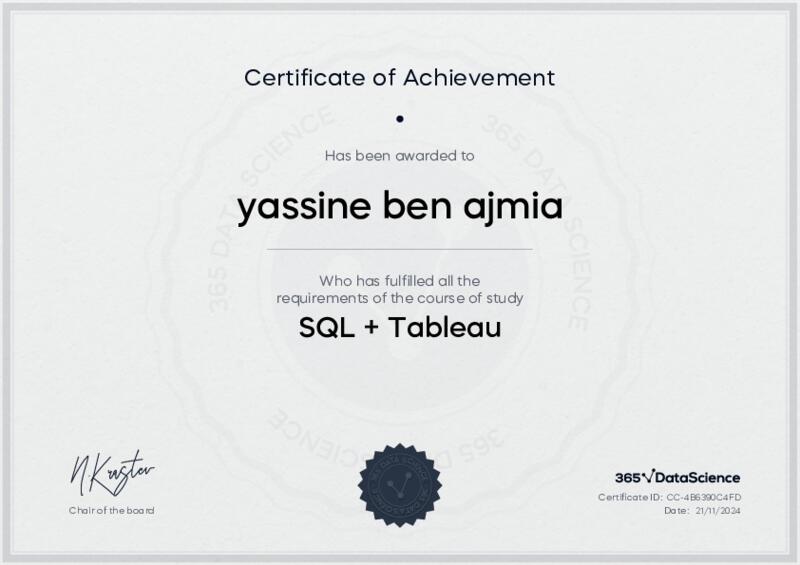 This user has been awarded the SQL + Tableau Certificate for successfully completing the course exam. Holding this certificate demonstrates their proficiency on the topic and signifies they are qualified to apply their newly acquired expertise in the fields of data analytics and data science.