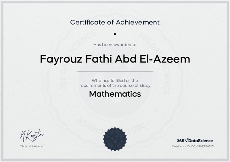 This user has been awarded the Mathematics Certificate for successfully completing the course exam. Holding this certificate demonstrates their proficiency on the topic and signifies they are qualified to apply their newly acquired expertise in the fields of data analytics and data science.