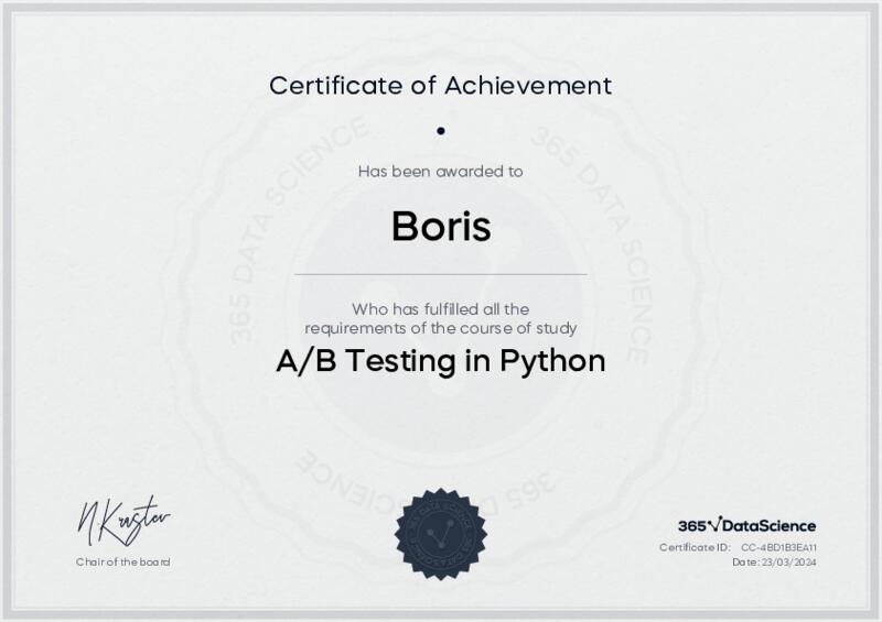 This user has been awarded the A/B Testing in Python Certificate for successfully completing the course exam. Holding this certificate demonstrates their proficiency on the topic and signifies they are qualified to apply their newly acquired expertise in the fields of data analytics and data science.