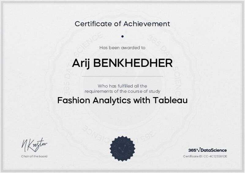 This user has been awarded the Fashion Analytics with Tableau Certificate for successfully completing the course exam. Holding this certificate demonstrates their proficiency on the topic and signifies they are qualified to apply their newly acquired expertise in the fields of data analytics and data science.