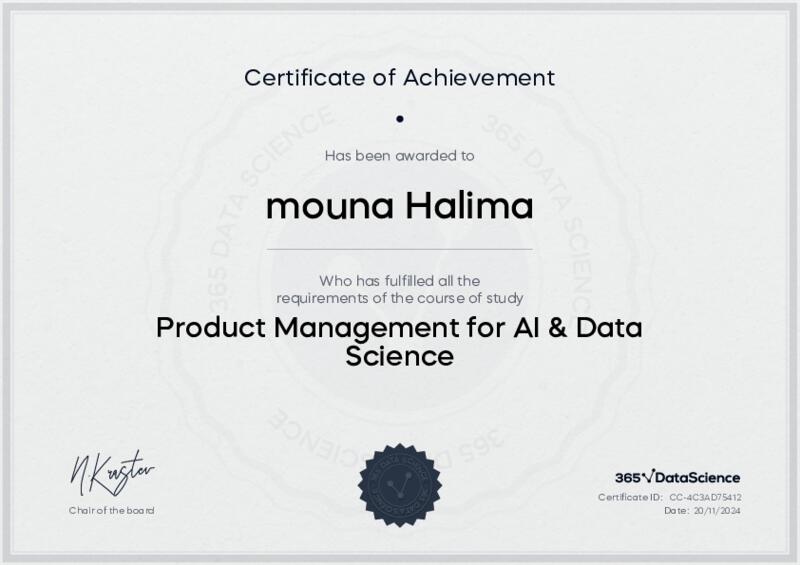 This user has been awarded the Product Management for AI & Data Science Certificate for successfully completing the course exam. Holding this certificate demonstrates their proficiency on the topic and signifies they are qualified to apply their newly acquired expertise in the fields of data analytics and data science.