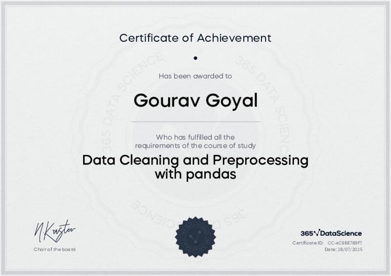 This user has been awarded the Data Cleaning and Preprocessing with pandas Certificate for successfully completing the course exam. Holding this certificate demonstrates their proficiency on the topic and signifies they are qualified to apply their newly acquired expertise in the fields of data analytics and data science.
