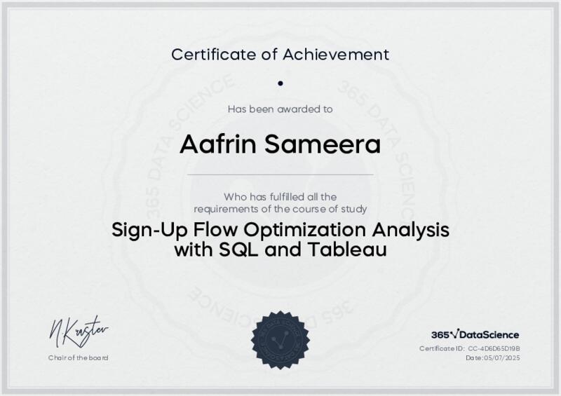 This user has been awarded the Sign-Up Flow Optimization Analysis with SQL and Tableau Certificate for successfully completing the course exam. Holding this certificate demonstrates their proficiency on the topic and signifies they are qualified to apply their newly acquired expertise in the fields of data analytics and data science.