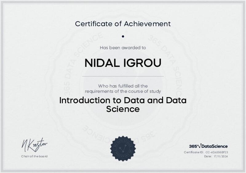 This user has been awarded the Introduction to Data and Data Science Certificate for successfully completing the course exam. Holding this certificate demonstrates their proficiency on the topic and signifies they are qualified to apply their newly acquired expertise in the fields of data analytics and data science.