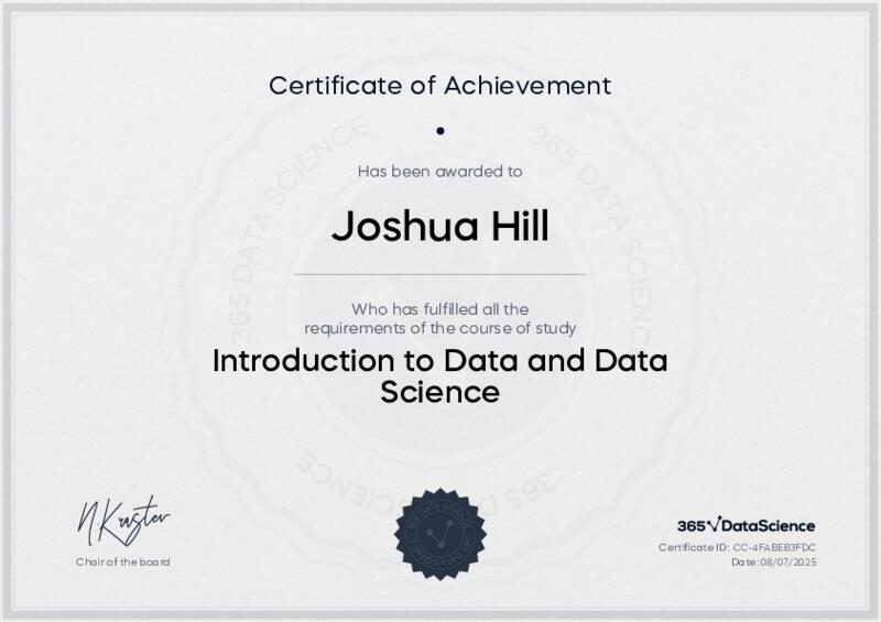 This user has been awarded the Introduction to Data and Data Science Certificate for successfully completing the course exam. Holding this certificate demonstrates their proficiency on the topic and signifies they are qualified to apply their newly acquired expertise in the fields of data analytics and data science.
