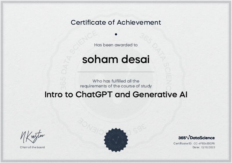 This user has been awarded the Intro to ChatGPT and Generative AI Certificate for successfully completing the course exam. Holding this certificate demonstrates their proficiency on the topic and signifies they are qualified to apply their newly acquired expertise in the fields of data analytics and data science.