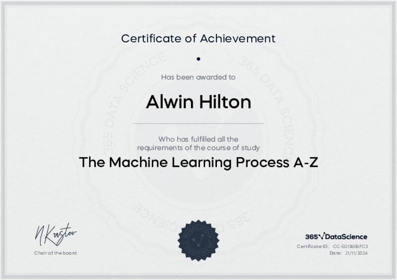 This user has been awarded the The Machine Learning Process A-Z Certificate for successfully completing the course exam. Holding this certificate demonstrates their proficiency on the topic and signifies they are qualified to apply their newly acquired expertise in the fields of data analytics and data science.