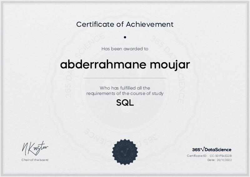 This user has been awarded the SQL Certificate for successfully completing the course exam. Holding this certificate demonstrates their proficiency on the topic and signifies they are qualified to apply their newly acquired expertise in the fields of data analytics and data science.