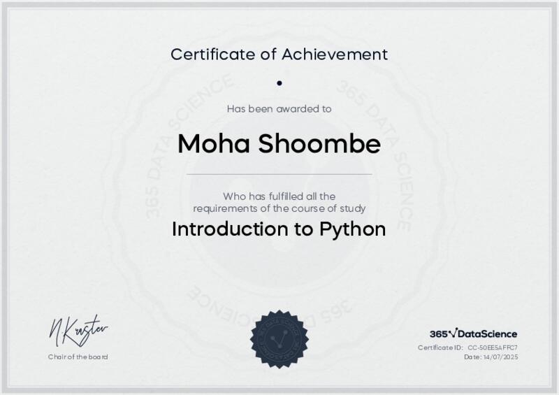 This user has been awarded the Introduction to Python Certificate for successfully completing the course exam. Holding this certificate demonstrates their proficiency on the topic and signifies they are qualified to apply their newly acquired expertise in the fields of data analytics and data science.