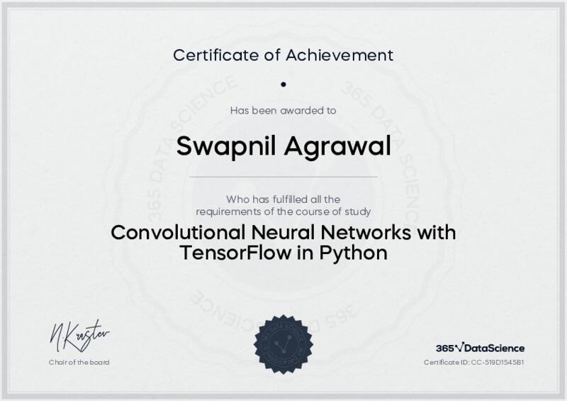 This user has been awarded the Convolutional Neural Networks with TensorFlow in Python Certificate for successfully completing the course exam. Holding this certificate demonstrates their proficiency on the topic and signifies they are qualified to apply their newly acquired expertise in the fields of data analytics and data science.