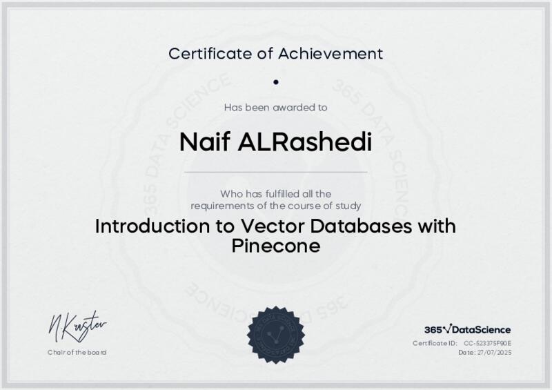This user has been awarded the Introduction to Vector Databases with Pinecone Certificate for successfully completing the course exam. Holding this certificate demonstrates their proficiency on the topic and signifies they are qualified to apply their newly acquired expertise in the fields of data analytics and data science.