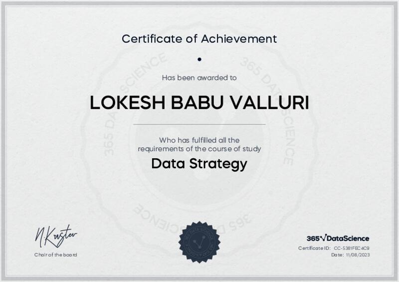 This user has been awarded the Data Strategy Certificate for successfully completing the course exam. Holding this certificate demonstrates their proficiency on the topic and signifies they are qualified to apply their newly acquired expertise in the fields of data analytics and data science.