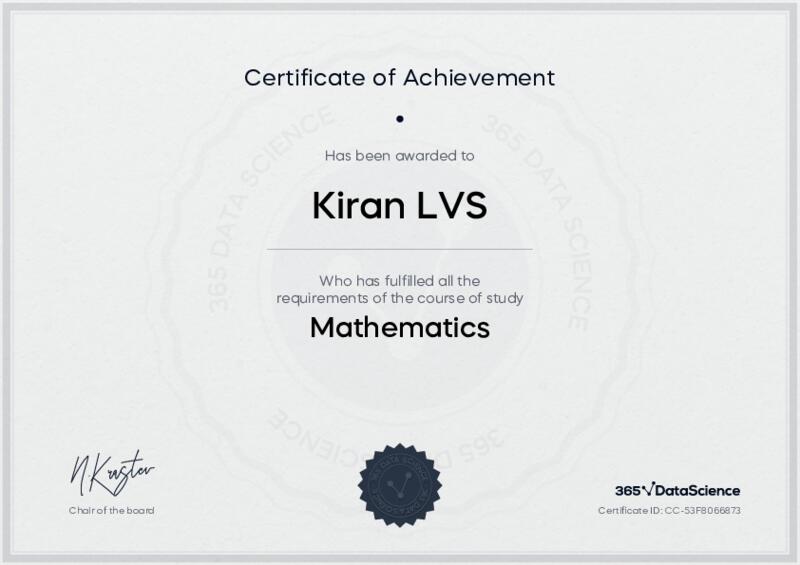 This user has been awarded the Mathematics Certificate for successfully completing the course exam. Holding this certificate demonstrates their proficiency on the topic and signifies they are qualified to apply their newly acquired expertise in the fields of data analytics and data science.