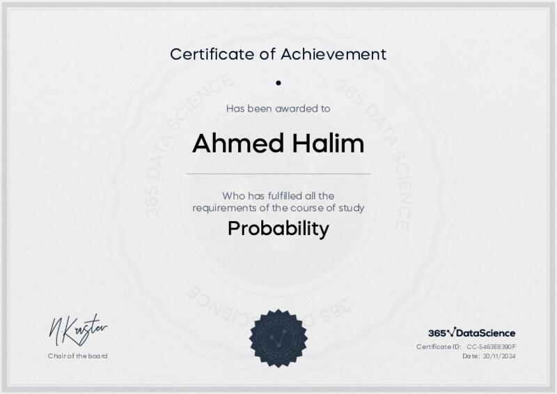 This user has been awarded the Probability Certificate for successfully completing the course exam. Holding this certificate demonstrates their proficiency on the topic and signifies they are qualified to apply their newly acquired expertise in the fields of data analytics and data science.