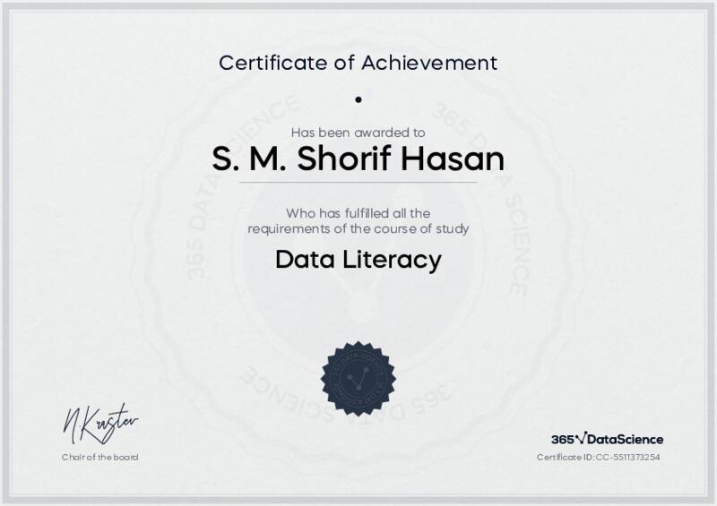 This user has been awarded the Data Literacy Certificate for successfully completing the course exam. Holding this certificate demonstrates their proficiency on the topic and signifies they are qualified to apply their newly acquired expertise in the fields of data analytics and data science.