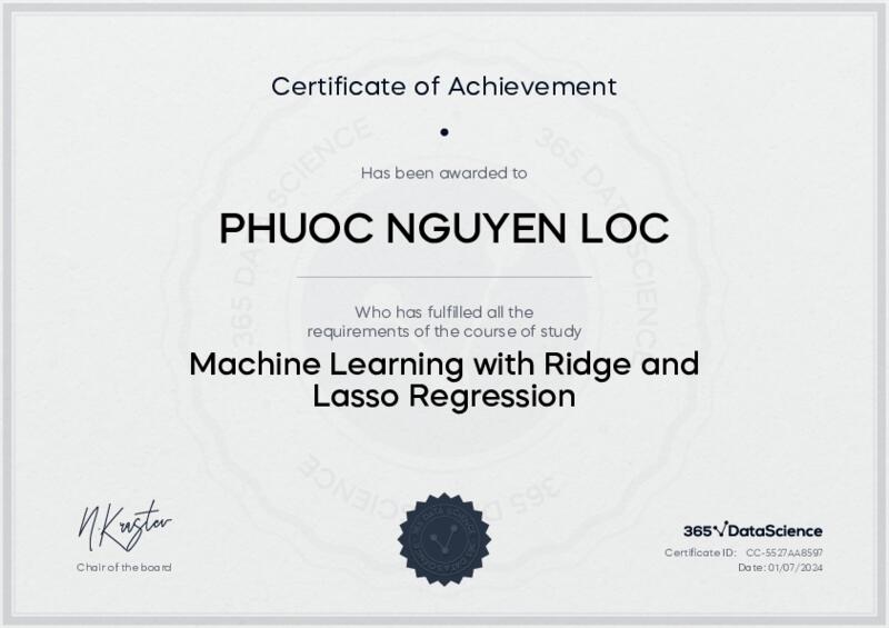 This user has been awarded the Machine Learning with Ridge and Lasso Regression Certificate for successfully completing the course exam. Holding this certificate demonstrates their proficiency on the topic and signifies they are qualified to apply their newly acquired expertise in the fields of data analytics and data science.