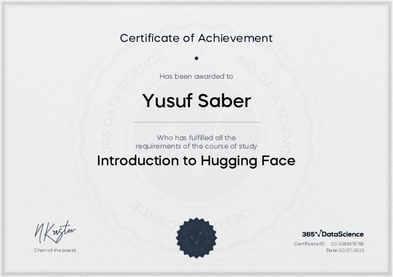 This user has been awarded the Introduction to Hugging Face Certificate for successfully completing the course exam. Holding this certificate demonstrates their proficiency on the topic and signifies they are qualified to apply their newly acquired expertise in the fields of data analytics and data science.