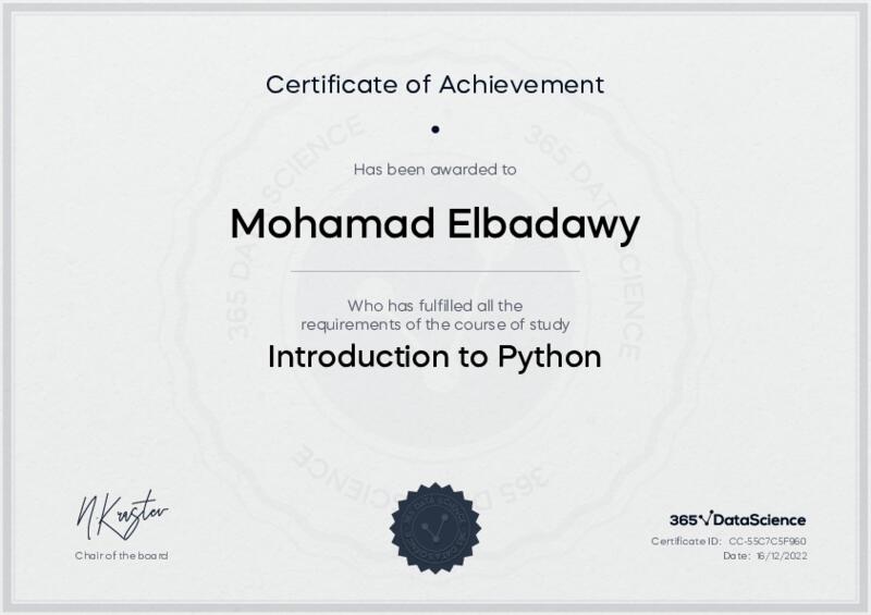 This user has been awarded the Introduction to Python Certificate for successfully completing the course exam. Holding this certificate demonstrates their proficiency on the topic and signifies they are qualified to apply their newly acquired expertise in the fields of data analytics and data science.