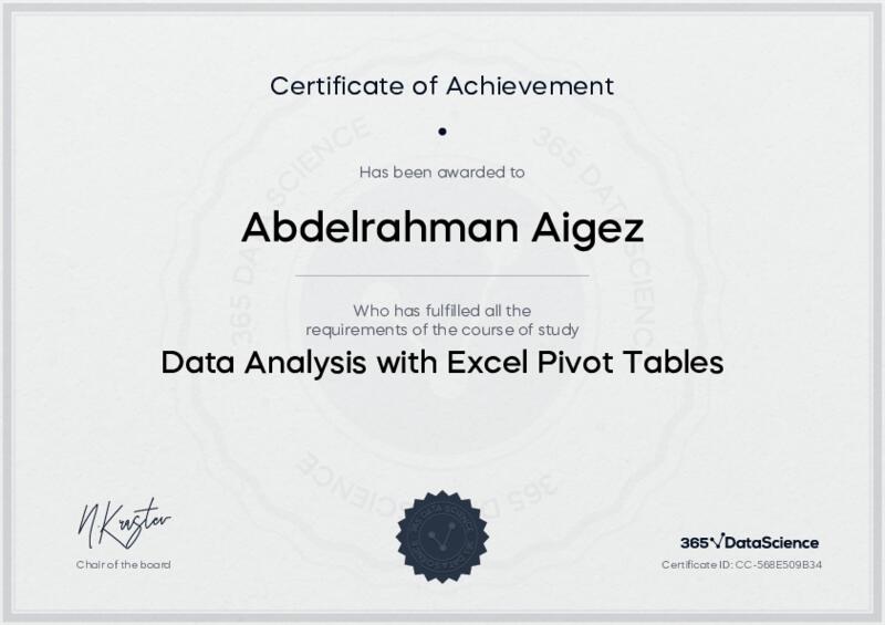 This user has been awarded the Data Analysis with Excel Pivot Tables Certificate for successfully completing the course exam. Holding this certificate demonstrates their proficiency on the topic and signifies they are qualified to apply their newly acquired expertise in the fields of data analytics and data science.