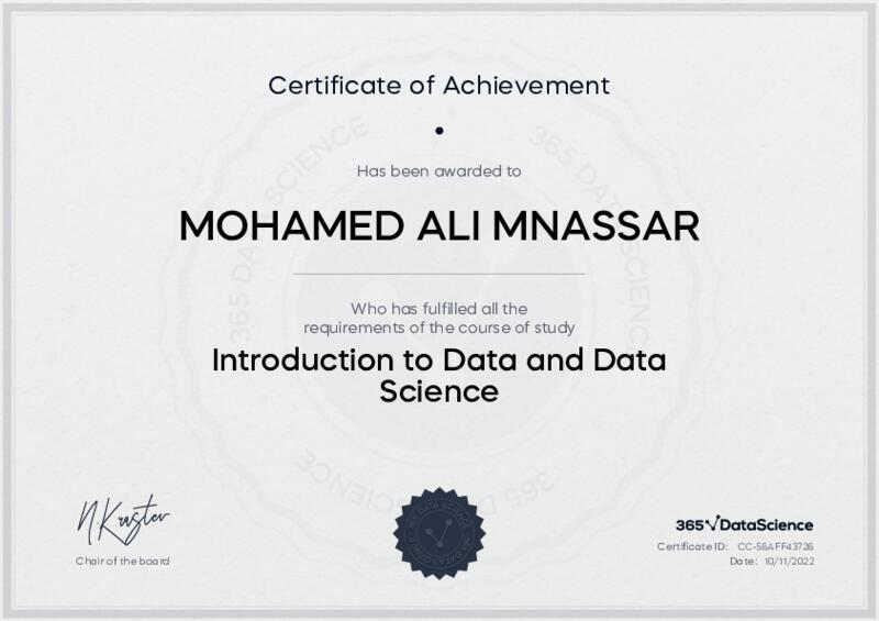 This user has been awarded the Introduction to Data and Data Science Certificate for successfully completing the course exam. Holding this certificate demonstrates their proficiency on the topic and signifies they are qualified to apply their newly acquired expertise in the fields of data analytics and data science.