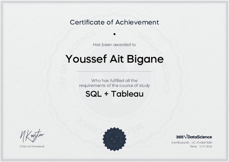 This user has been awarded the SQL + Tableau Certificate for successfully completing the course exam. Holding this certificate demonstrates their proficiency on the topic and signifies they are qualified to apply their newly acquired expertise in the fields of data analytics and data science.