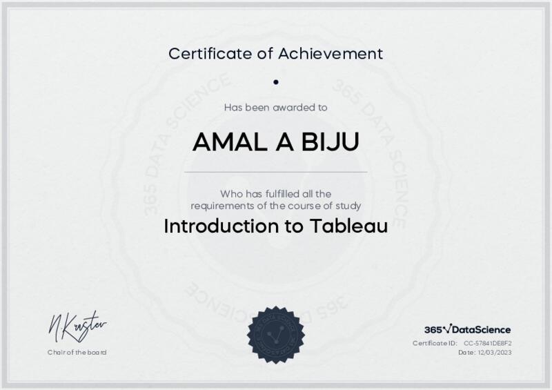 This user has been awarded the Introduction to Tableau Certificate for successfully completing the course exam. Holding this certificate demonstrates their proficiency on the topic and signifies they are qualified to apply their newly acquired expertise in the fields of data analytics and data science.