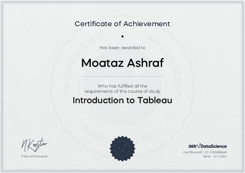 This user has been awarded the Introduction to Tableau Certificate for successfully completing the course exam. Holding this certificate demonstrates their proficiency on the topic and signifies they are qualified to apply their newly acquired expertise in the fields of data analytics and data science.