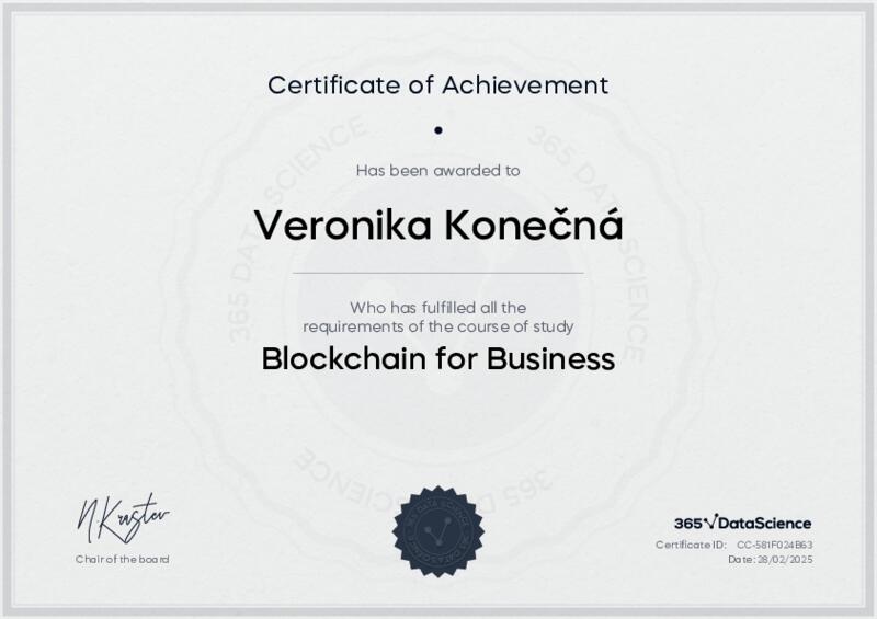 This user has been awarded the Blockchain for Business Certificate for successfully completing the course exam. Holding this certificate demonstrates their proficiency on the topic and signifies they are qualified to apply their newly acquired expertise in the fields of data analytics and data science.