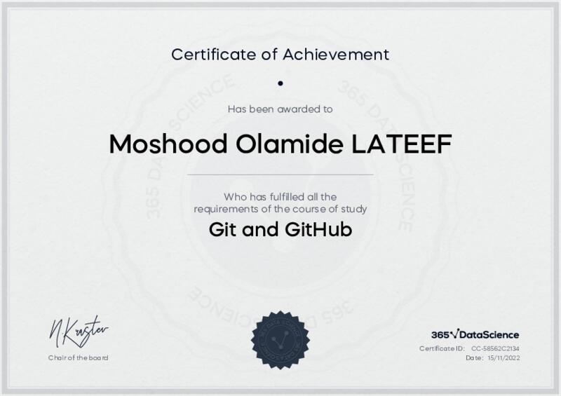 This user has been awarded the Git and GitHub Certificate for successfully completing the course exam. Holding this certificate demonstrates their proficiency on the topic and signifies they are qualified to apply their newly acquired expertise in the fields of data analytics and data science.