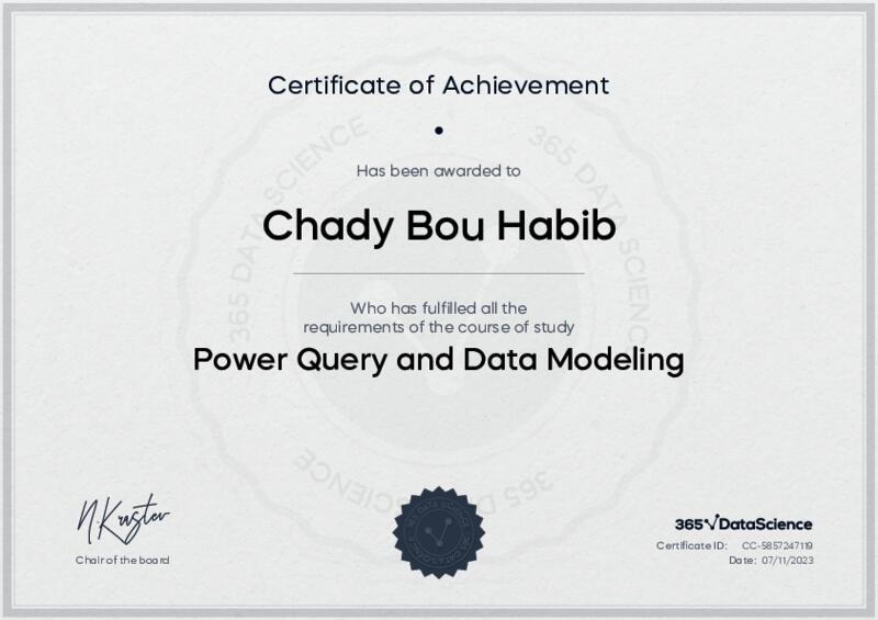 This user has been awarded the Power Query and Data Modeling Certificate for successfully completing the course exam. Holding this certificate demonstrates their proficiency on the topic and signifies they are qualified to apply their newly acquired expertise in the fields of data analytics and data science.