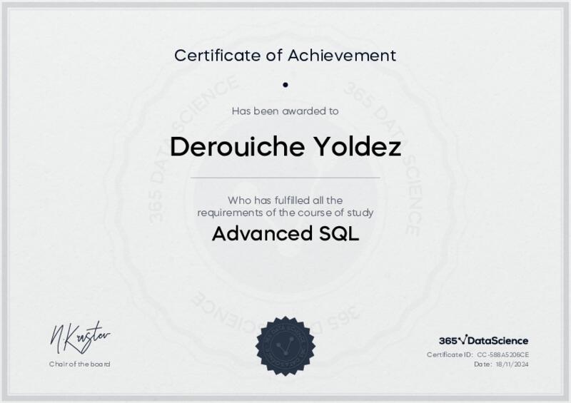 This user has been awarded the Advanced SQL Certificate for successfully completing the course exam. Holding this certificate demonstrates their proficiency on the topic and signifies they are qualified to apply their newly acquired expertise in the fields of data analytics and data science.