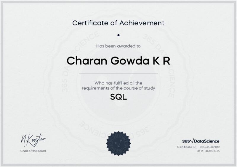 This user has been awarded the SQL Certificate for successfully completing the course exam. Holding this certificate demonstrates their proficiency on the topic and signifies they are qualified to apply their newly acquired expertise in the fields of data analytics and data science.