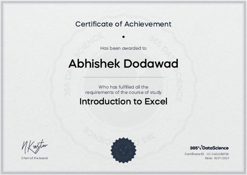 This user has been awarded the Introduction to Excel Certificate for successfully completing the course exam. Holding this certificate demonstrates their proficiency on the topic and signifies they are qualified to apply their newly acquired expertise in the fields of data analytics and data science.