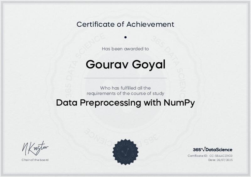 This user has been awarded the Data Preprocessing with NumPy Certificate for successfully completing the course exam. Holding this certificate demonstrates their proficiency on the topic and signifies they are qualified to apply their newly acquired expertise in the fields of data analytics and data science.