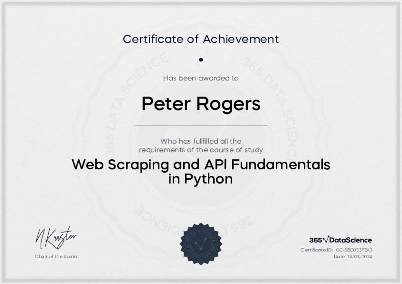 This user has been awarded the Web Scraping and API Fundamentals in Python Certificate for successfully completing the course exam. Holding this certificate demonstrates their proficiency on the topic and signifies they are qualified to apply their newly acquired expertise in the fields of data analytics and data science.
